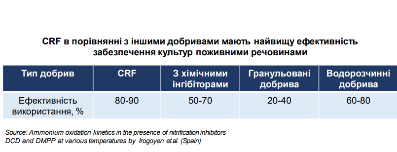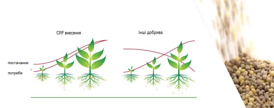 CRF вивільняють поживні речовини з повільною але контрольованою швидкістю, це дозволяє синхронізувати доставку поживних речовин відповідно до потреби культури.